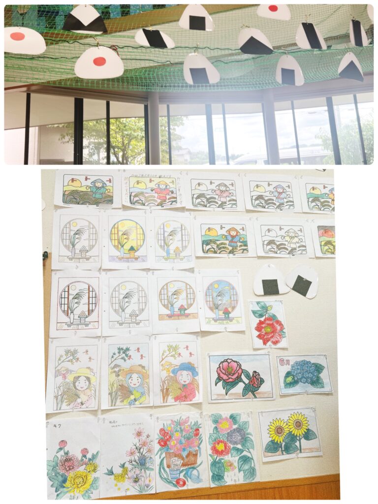 デイルームの飾りは、ご利用者様が色んな「おにぎり」を作ってくれて「海苔」を巻いてくれました!