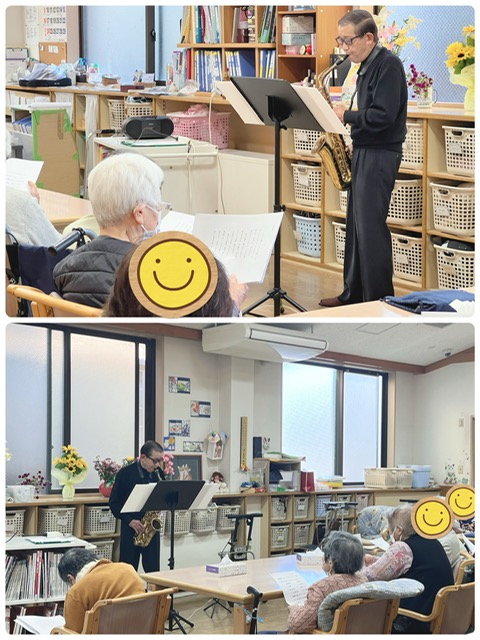 姫島デイサービスセンターには、ボランティアセンターの皆さんが訪問に来てくださいます。11月17日には、サックス演奏者さんが来て下さいました。知床旅情、二輪草、ここに幸なりなど7曲演奏してくださり、ご利用者様も歌集を見ながら歌いました。サックスの生演奏に、皆さんうっとりされていましたね!