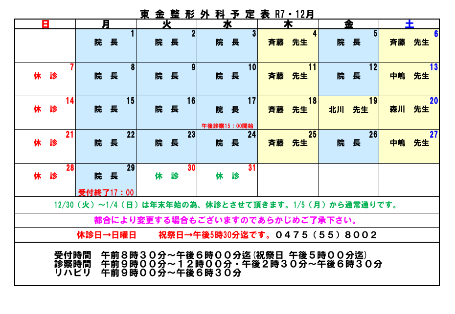 12月の外来診療予定表を掲載いたします。