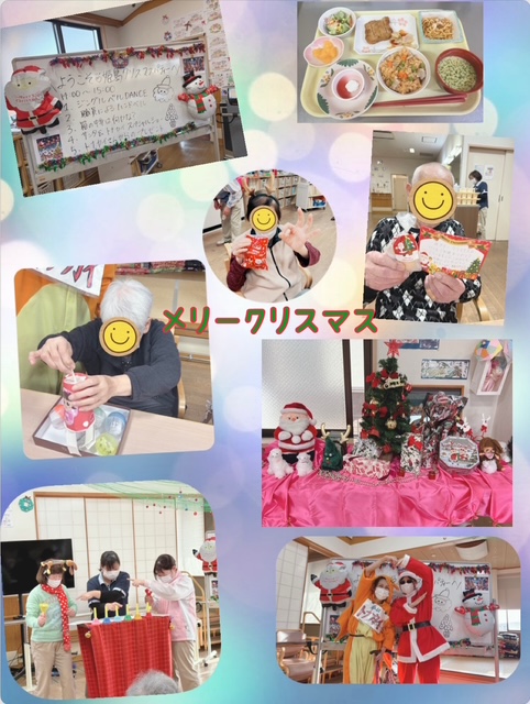姫島デイサービスセンターでは、12月23.24.25日にクリスマスパーティを行いました!職員によるダンスやハンドベル、サンタとトナカイによるスペシャルショーやトナカイからのプレゼントなど盛り沢山なパーティになりました!🎅姫島デイサービスセンターからのクリスマスメッセージも皆さん喜んでいただけましたでしょうか?25日はクリスマスイベント食でお昼ご飯もチキンがでて豪華なお食事となりました。