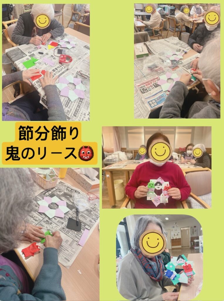 鬼がついたリースの制作となっています。折り紙を折る作業はご利用者様に作っていただいて、