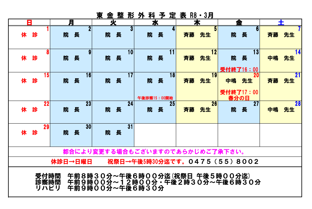 受付時間・診療時間が都合により急遽変更する場合がございます。受付時間終了間際の受診を検討されている場合は事前にご確認いただくか、早めの時間帯での受診をご検討ください。