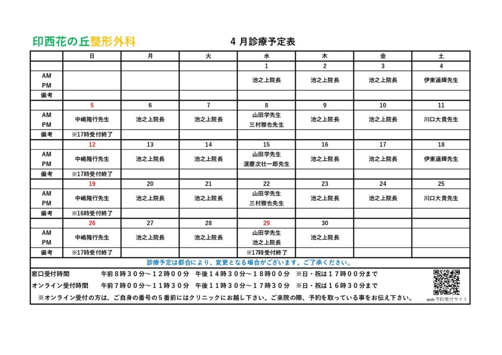 皆様には、ご報告が遅くなりましたが、4月の診療予定表を掲載いたします。